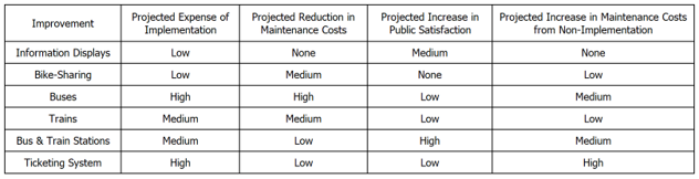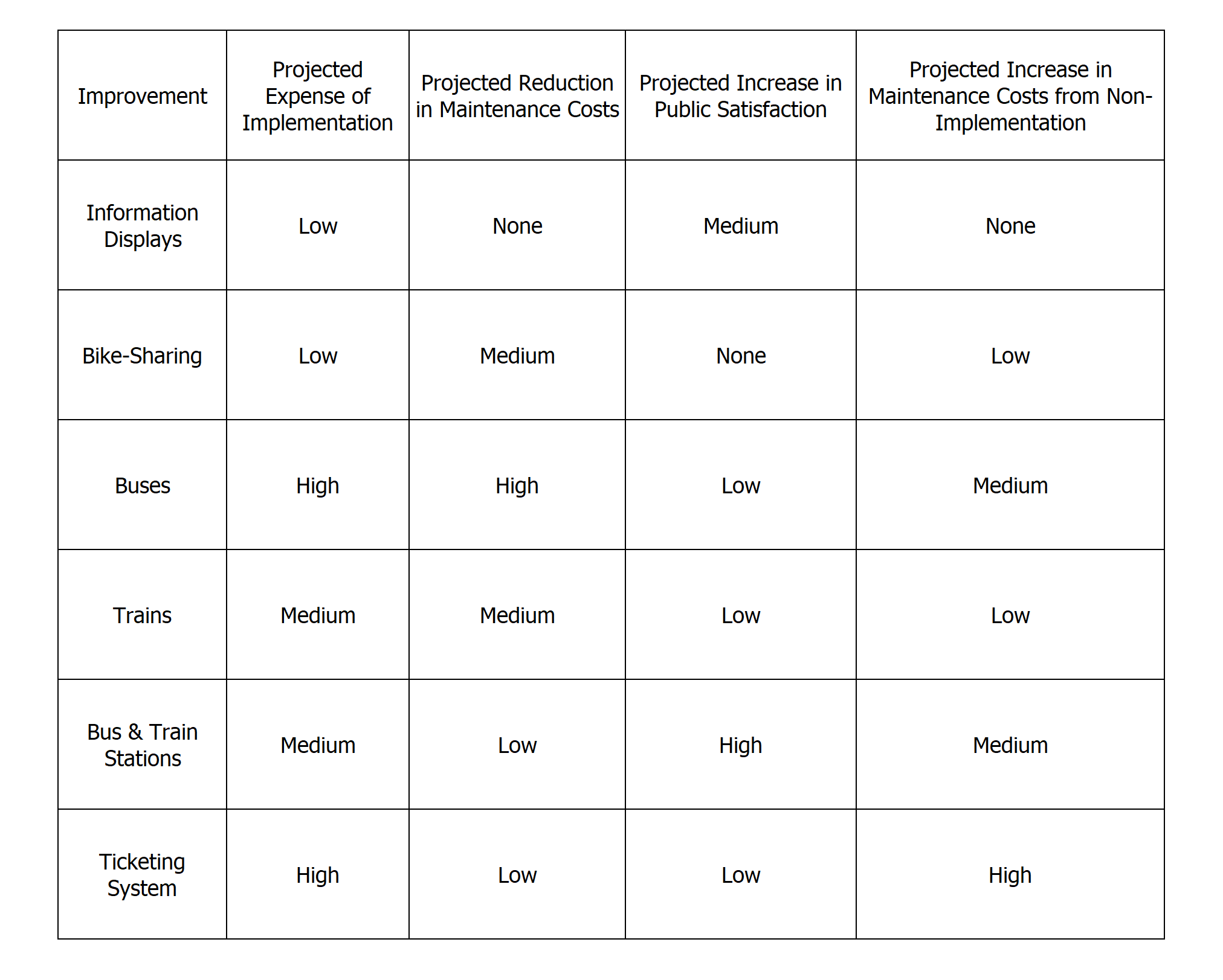 | upgrading bus and train stations would have a greater impact on public satisfaction than any of the other possible improvements |