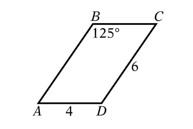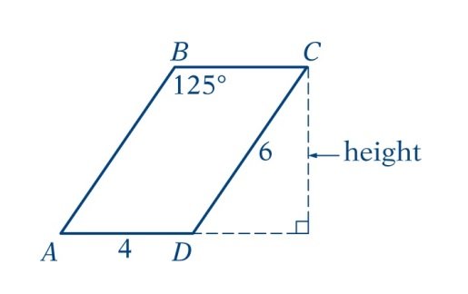 Official ExplanationIn this question you are asked to compare the area of a parallelogram with an area of 24, given two side lengths and the measure of one interior angle of the parallelogram. Since the measure of the interior angle given is 125°, you can conclude that the parallelogram is not a rectangle.