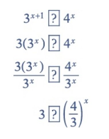For any value of x, the value \(3^x\) of is positive, so dividing by \(3^x\) does not change any inequality that could be put in the placeholder. Since each step in this simplification is reversible, this reduces the problem to comparing 3 with \((\frac{4}{3})^x.\)