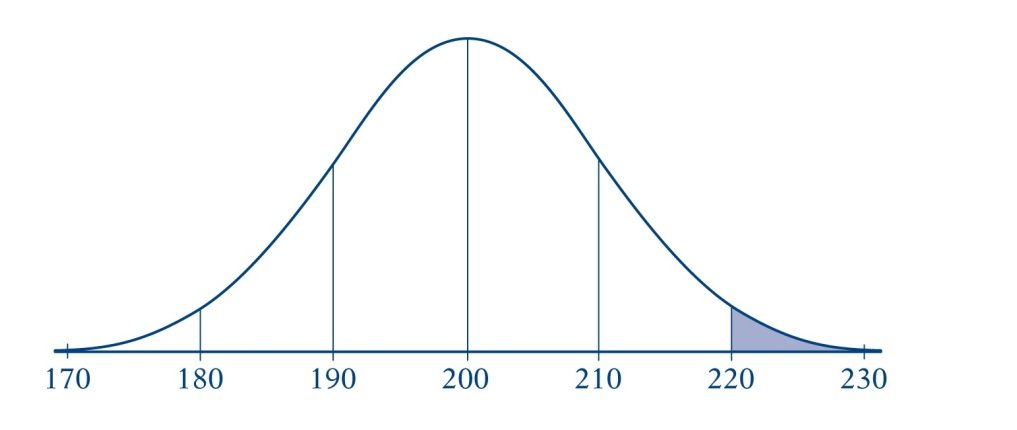 The curve is symmetric about the mean 200. The values of 210, 220, and 230 are equally spaced to the right of 200 and represent 1, 2, and 3 standard deviations, respectively, above the mean. Similarly, the values of 190, 180, and 170 are 1, 2, and 3 standard deviations, respectively, below the mean. Quantity A, the probability of the event that the value of Y is greater than 220, is equal to the area of the shaded region as a fraction of the total area under the curve.