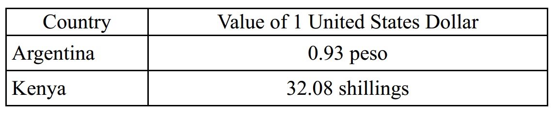 In the table accompanying this question, both the value of the Argentine peso and the value of the Kenyan shilling are compared to the United States