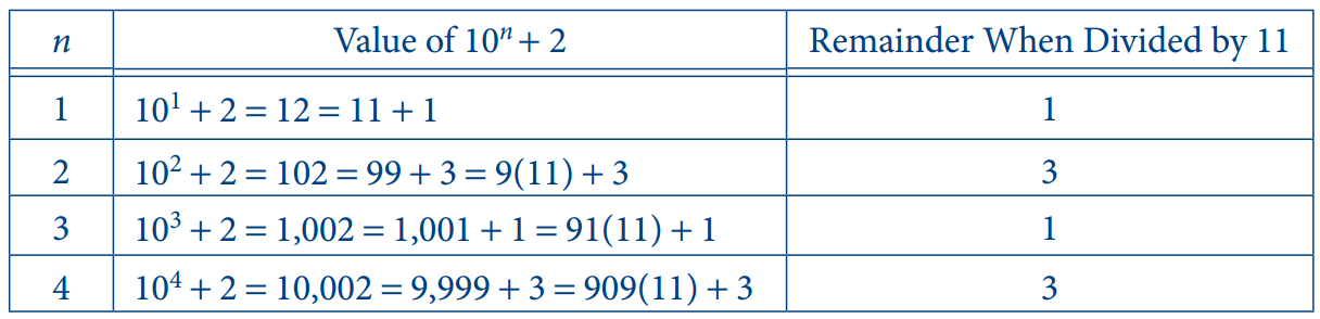 OEActually dividing \(10^{32} + 2\) by 11 would be very time consuming, so it is worth trying to compare the quantities without actually doing the division. A good approach would be to compute the remainders when \(10^1 + 2, 10^2 + 2, 10^3 + 2, 10^4 + 2,\) etc., are divided by 11 to see if there is a pattern that can help you determine the remainder when \(10^{32} + 2\) is divided by 11. The following table shows the first few cases.