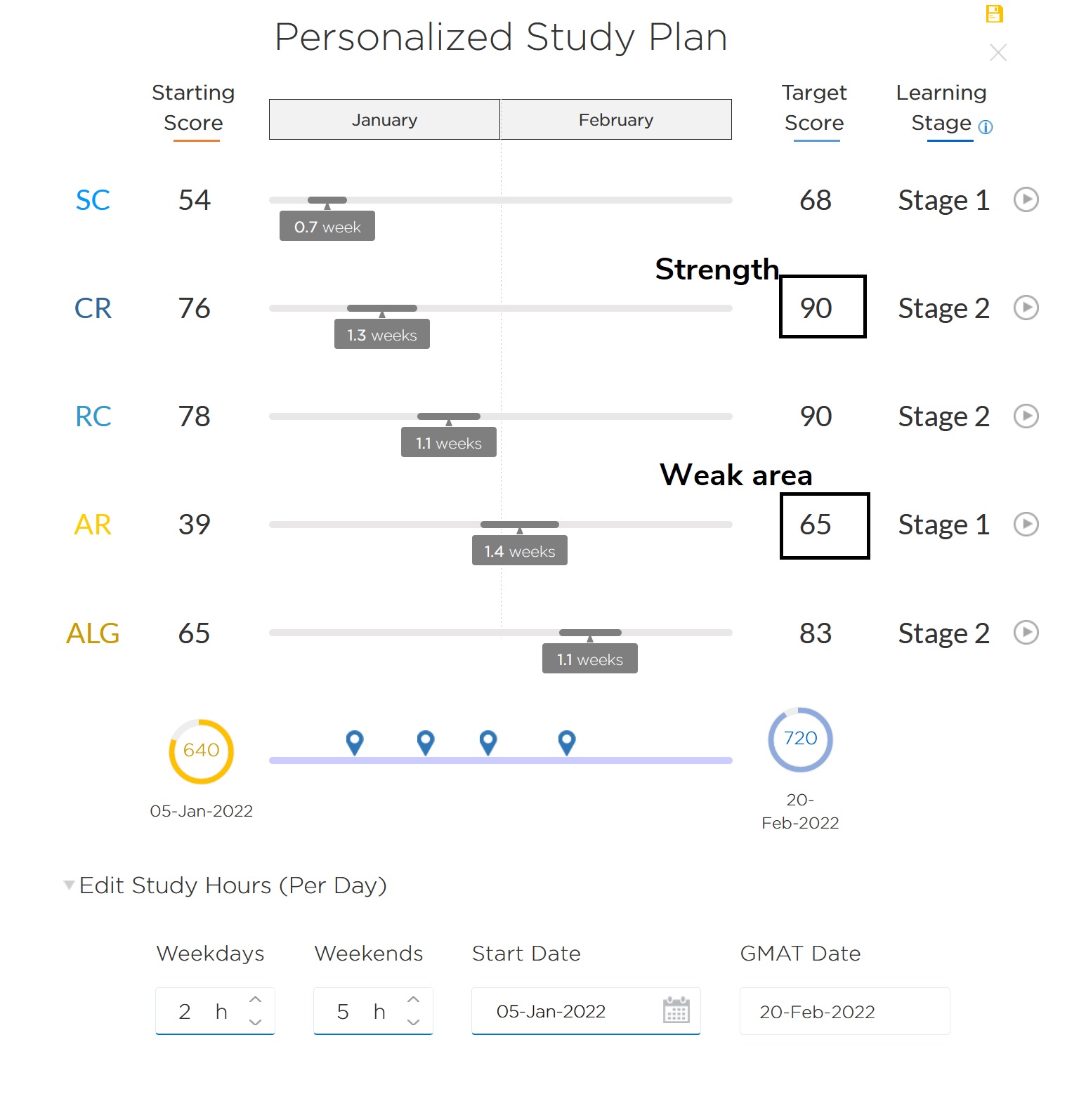 One-on-One Strategy Session with e-GMAT expertsBtw, here is a screenshot showing how your personalized study plan (at a high level) should look like (Baseline scores, targets and time estimates as per your strengths and weak areas)