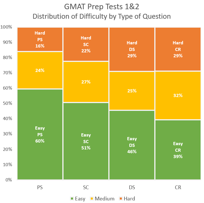 Based on the scale, 23% of all GMAT Prep tagged Questions are Hard, 50% are easy, and 27% are medium. This is somewhat as expected... I was expecting to see perhaps 50-35-15 or something like that distribution but this may be due to how we decided to draw the lines in terms of difficulty. However, one thing is clear, the majority of questions are Easy. There are also different distributions within each of the categories: DS, PS, CR, and SC (RC was not tested/included in this project).