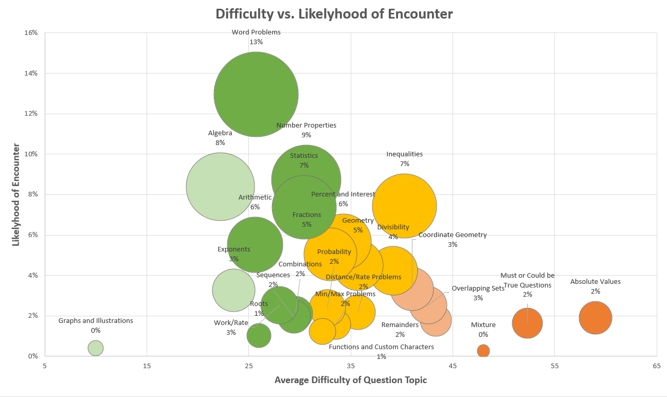 Some conclusions: - You definitely want to master the BIG "Green" topics such as Word Problems, Fractions, Arithmetic, Number Properties. Untile you go through the "Green" zone, you wont' get to the Yellow and Orange zones that have the most points