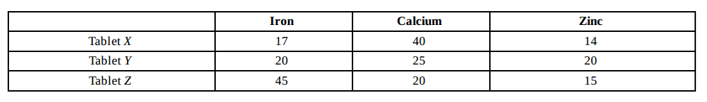 We are trying to arrive at 140 mg of iron and 160 mg of calcium efficiently, so we might as well not consume any of Tablet Y, which is highest in zinc, the one element we have no interest in. Notice that 3 of Tablet X and 2 of Tablet Y would contain 3 × 40 + 2 × 20 = 120 + 40 = 160 mg of calcium exactly. This same combination contains 3 × 17 + 2 × 45 = 51 + 90 = 141 mg of iron, which is greater than 140, as required. This combination of 3 + 2 = 5 tablets achieves the desired quantities with very little wastage. No combination of four tablets will have sufficient amounts of both iron and calcium, so 5 is the minimum.