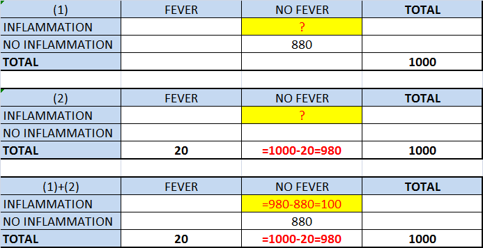 Noticed that I placed a red star in the box representing our target question (the number of children who developed inflammation but not fever)