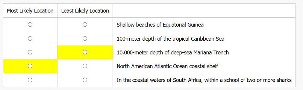 Least Likely Location the location where it would be least likely found. Make only two selections, one in each column.