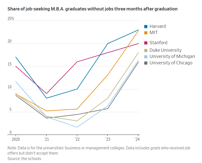 One school improved hiringThe share of 2024 M.B.A.s still on the market months after graduation more than doubled at most highly ranked business schools when compared with 2022, according to a Wall Street Journal analysis of school data. At some, including the University of Chicago’s Booth School and Northwestern University’s Kellogg School, the share of students still looking more than tripled.