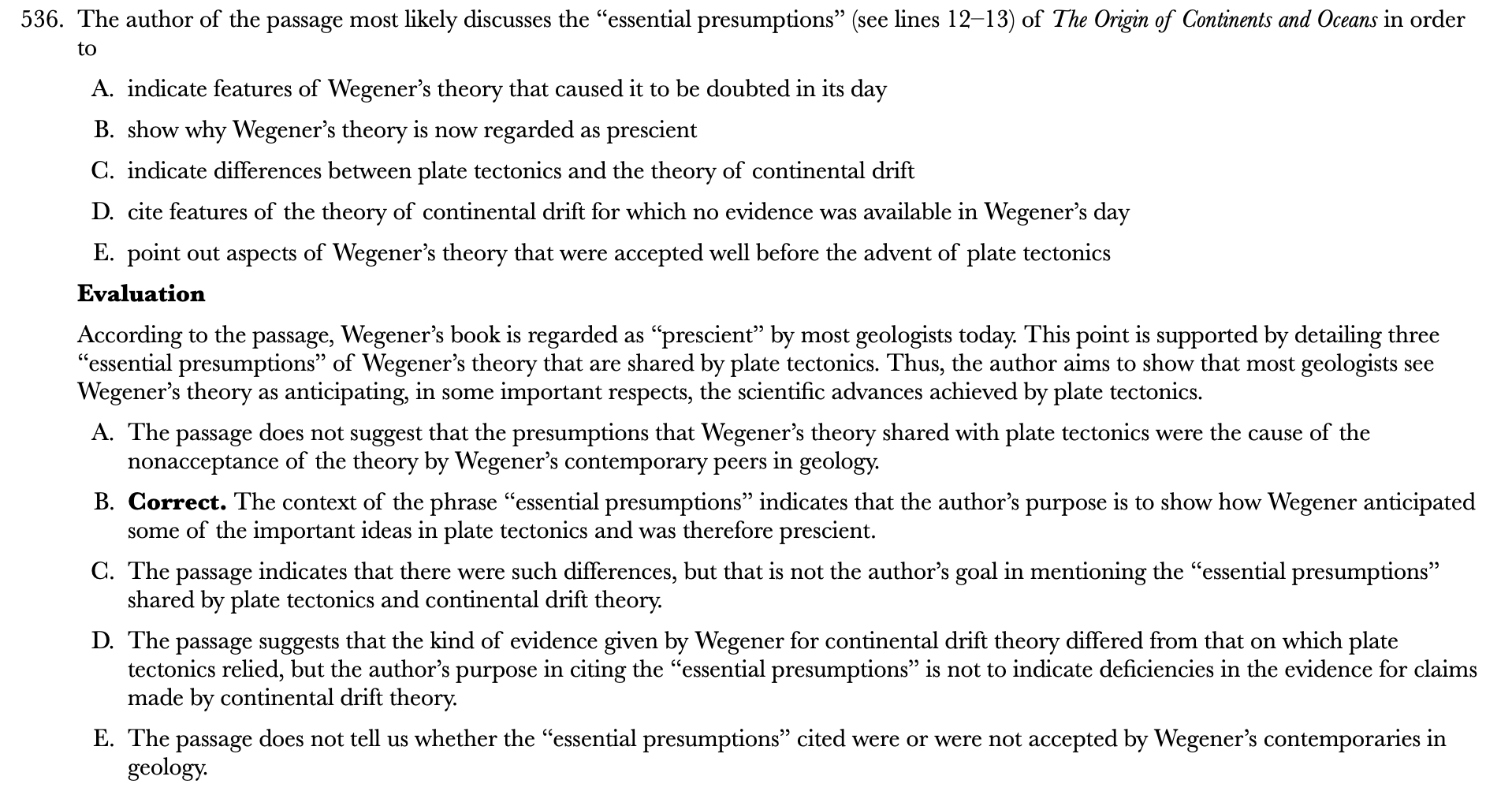 B) Show why Wegener's theory os now regarded as prescient.D) Cite features of the theory of continental drift for which no evidence was available in Wegener's dayExplanation: The context of the phrase "essential presumptions" indicates that the author's purpose is to show how Wegener anticipated some of the important ideas in plate tectonics and was therefore prescient.
