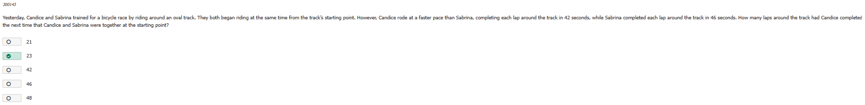 Now, Candice would have done \(\frac{42*23}{42}\) or 23 laps at the rate of 42 secs per lap.