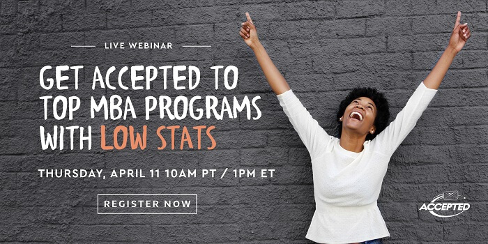 Don’t do this alone! Learn how to get accepted to b-school with low stats. The webinar is free, but you must reserve your space – do it today!